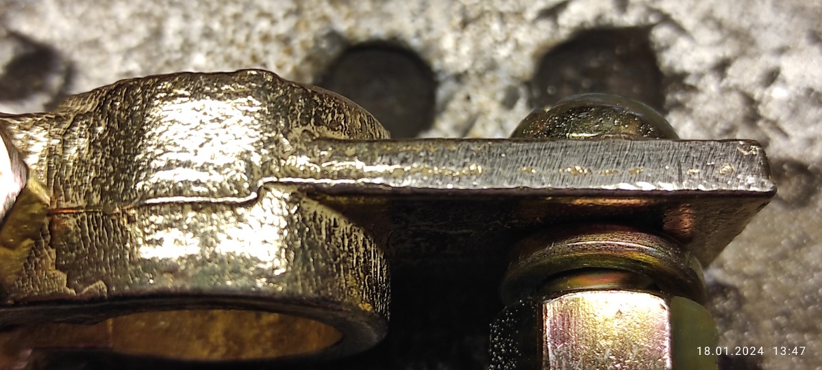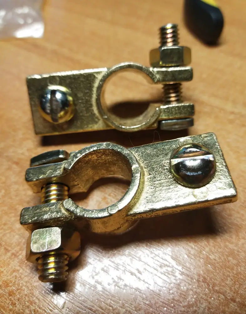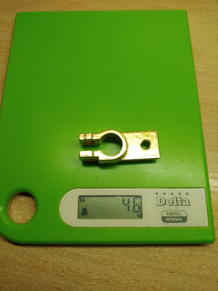 Неплохие клеммы. На латунь не похоже, скорее всего бронзовое литье. Латунь пластична, а этот сплав хрупкий, при попытке откусить уголок бокорезами он легко откололся. То, что это все-таки медный сплав, а не крашеный силумин, уже хорошо, но затягивать клемму нужно без фанатизма. Площадка под кабельный наконечник не обработана, лучше ее шлифануть до ровной плоскости.