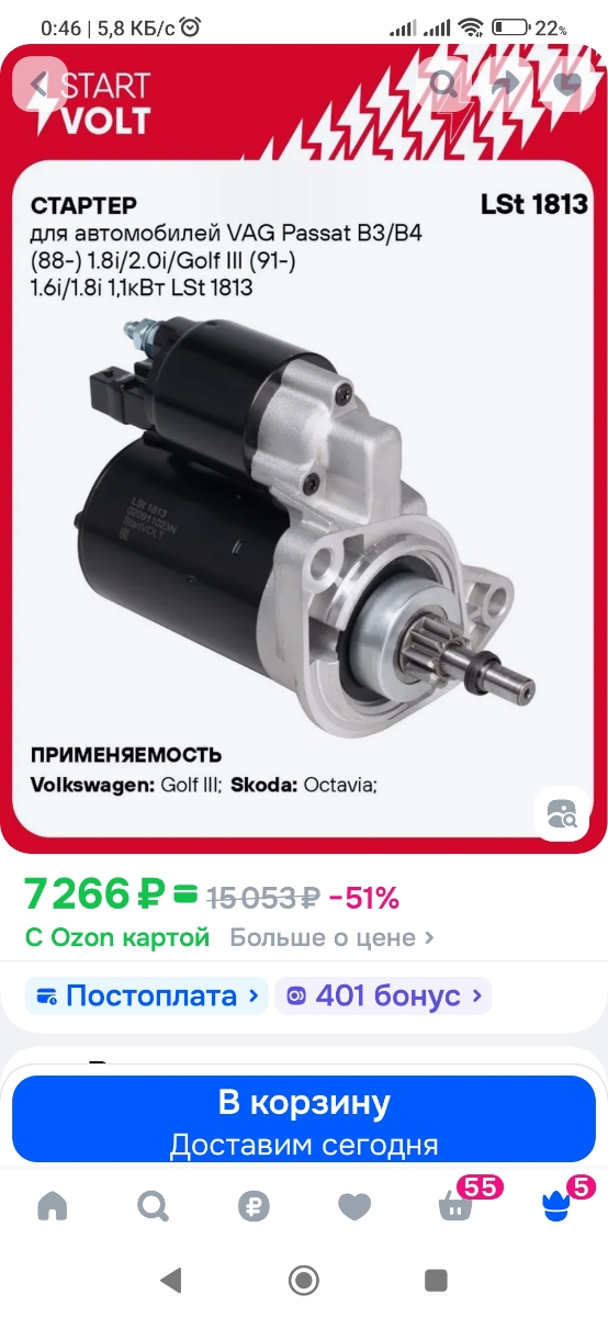 Стартер для автомобилей VAG Passat B3/B4 (88-) 1.8i/2.0i/Golf III (91-) 1.6i/1.8i 1,1кВт